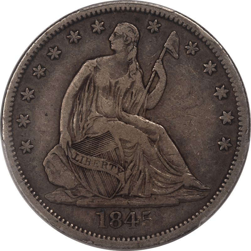 Seated Half Dollar No Motto (1839 – 1853, 1856 – 1866) - With the advent of the steam driven presses at the Mint facilities, newly appointed “second” engraver Christian Gobrecht began work on redesigning the nation’s coinage. The Gobrecht designs crossed all silver denominations with the work based on sketches by Thomas Sully and Titian Peale. The new half dollar incorporated a .900 silver composition that was incorporated with the Reeded halves and was a departure from earlier halves compositions designated by Congress in 1792. The overall weights were again changed and designated on the coins with the addition of arrows and rays in 1853-1855. These devices were removed and the No Motto type was struck again using the reduced weight until 1866 when the design changed another time with the addition of the motto IN GOD WE TRUST.