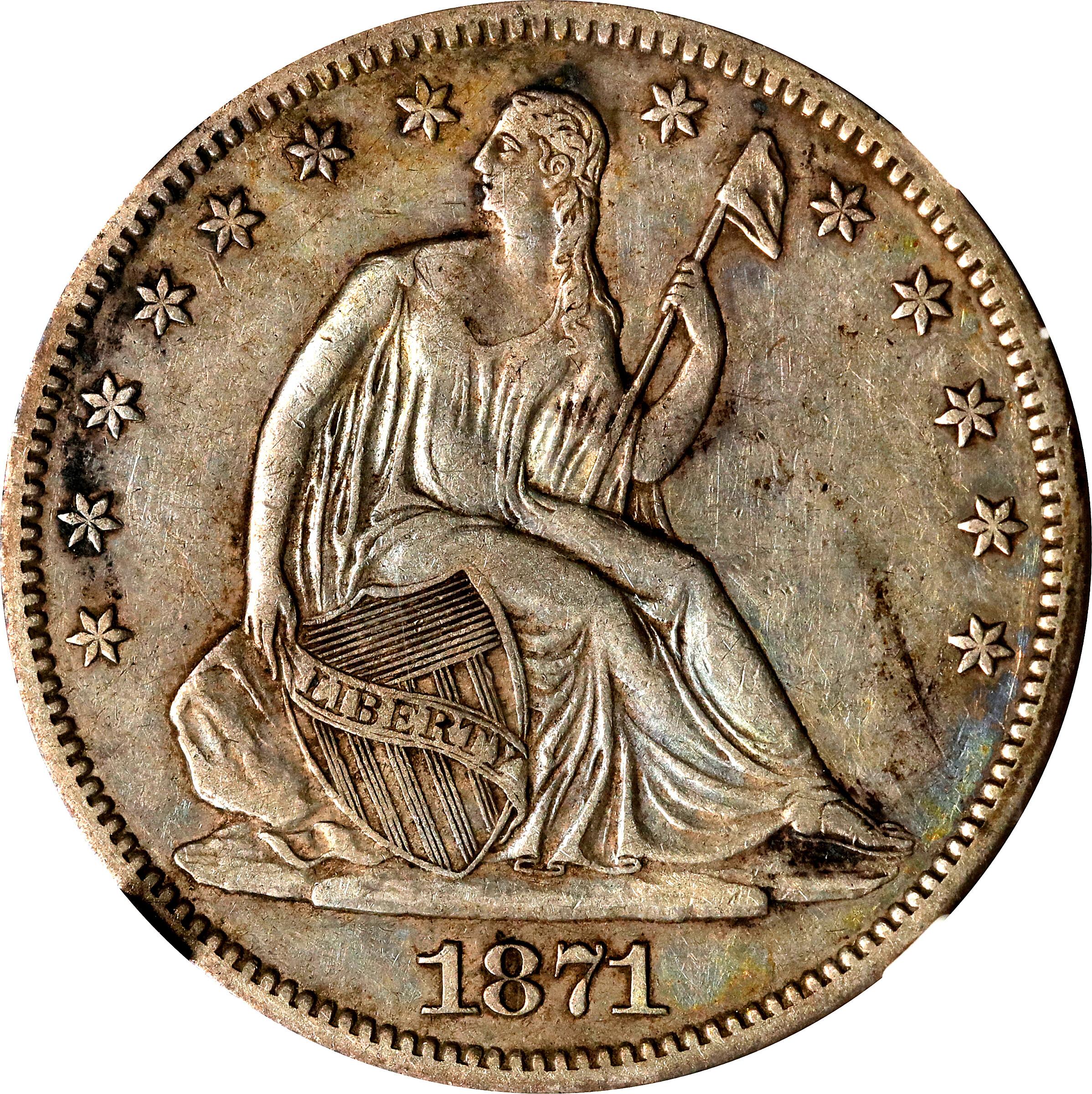 The 1871 Carson City Mint silver dollar is a rare coin in any grade, with an estimated 100 survivors overall. This is no surprise, given its very small mintage. Clearly, the large (by comparison) production of 1870 greatly reduced the need for additional dollars this year. There was never a substantial need for these coins, judging by the small mintages of the two following years, but circulate they did. Most survivors are well worn and/or damaged, and readers are urged to study the population of Details graded pieces by clicking on the block letter D for this issue in the NGC Census. The few Mint State coins known are all prooflike to some degree, as the dies didn't wear enough to lose their initial polish. Some weakness of strike is seen on nearly all examples, this being most evident in the shallowness of the word LIBERTY. This feature is directly opposite the upper part of the eagle's right wing, which is another area of weakness. This technical deficiency is seen in many coins of the type from all three mints, but Carson City seems to have had the most difficulty in bringing up LIBERTY across several denominations. Just a single pair of dies was employed for this issue, the reverse die being one that had been used previously to coin 1870-CC dollars. The obverse exhibits a misplace numeral 1 within the denticles below the 7 of the date, but as all 1871-CC silver dollars are from this single die there is no variety interest.