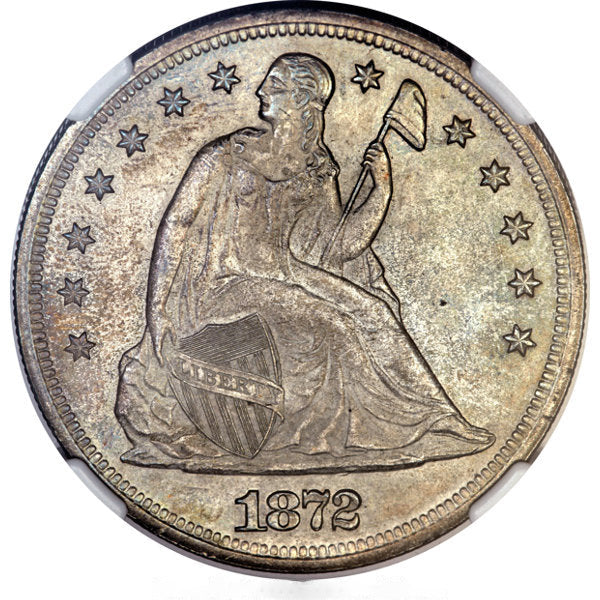 The 1872 Seated Liberty dollar claims a series-high mintage of 1,105,500 pieces, but the issue is more difficult to locate than that large production total would indicate. The coins were all paid out to depositors who brought silver bullion to the Mint, but a number of coins surfaced in the Treasury releases of the early 1960s. Rumors of a full bag of Uncirculated 1872 silver dollars being released in the 1962-1964 period are unconfirmed, but a significant number of coins did come on the market from the Treasury hoard during that era. It seems likely that some of the original depositors returned their holdings to the Treasury Department after the intrinsic value of a silver dollar fell below its face value in 1873, rather than spending them in commerce. However, the consignor's family acquired the present piece long before the Treasury hoard was released.