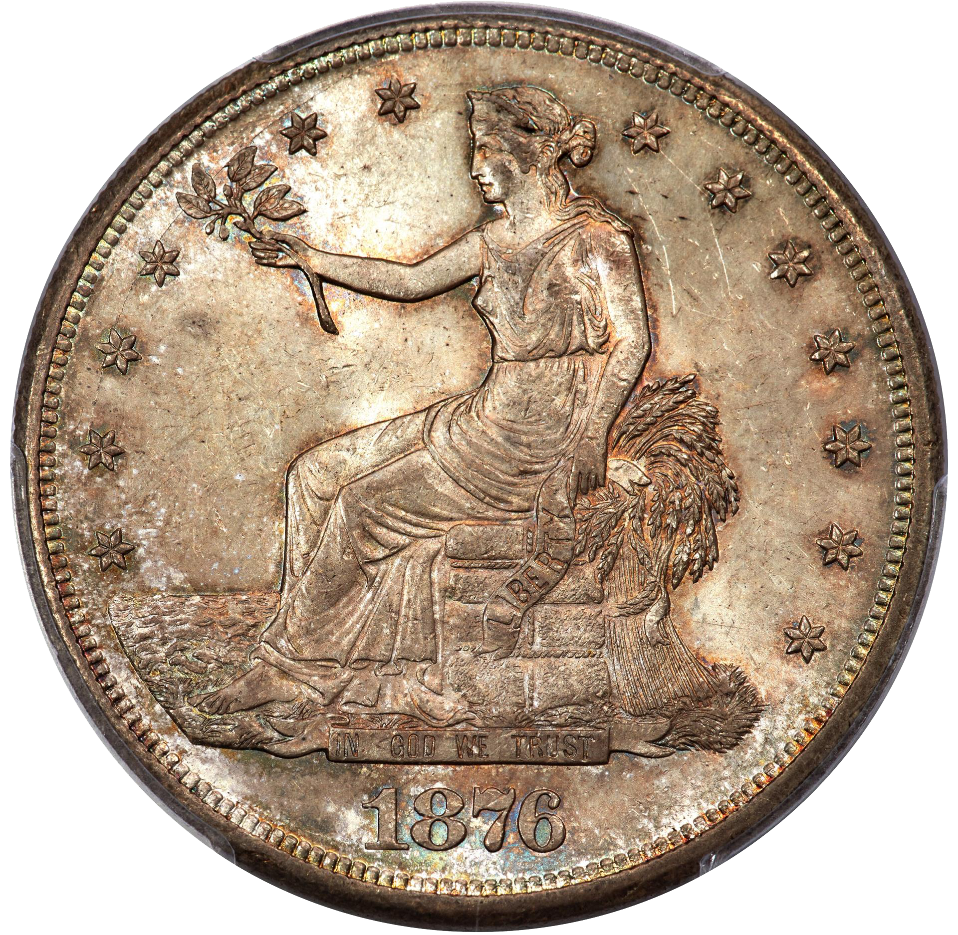 The United States Congress authorized the U.S. Mint to create a Trade Dollar to improve trade with the Orient, China in particular. It was legal tender all around the world, but especially in Asia and was minted from 1873 to 1885.