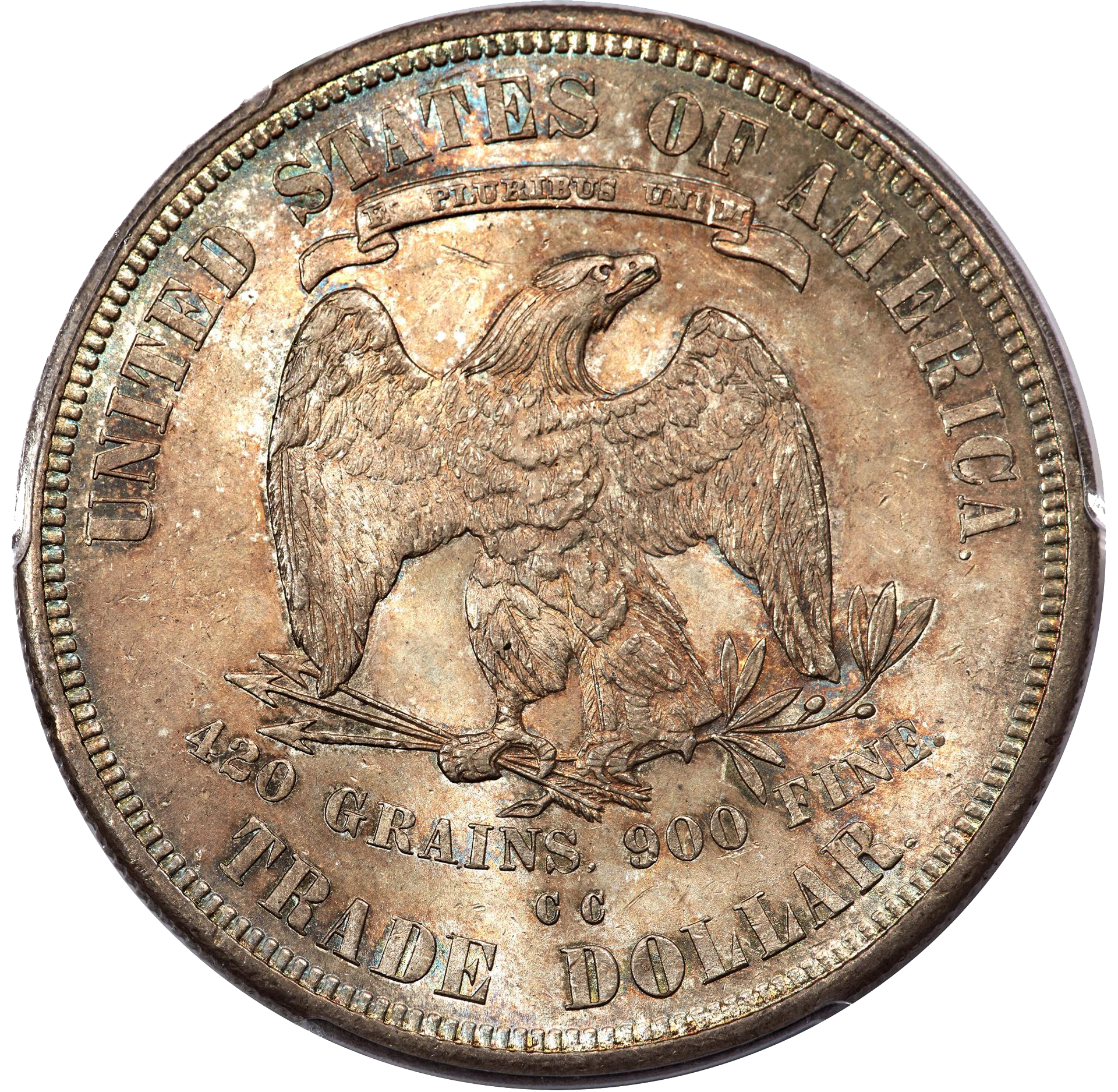 - Reverse: An American Bald Eagle facing right. A floating banner above the eagle states “E PLURIBUS UNUM” while above the banner are the words “UNITED STATES OF AMERICA.” The eagle holds three arrows in her right talon and an olive branch in her left. Below the eagle is the weight (420 grains) and the fineness (.900 Silver). Below is the denomination “TRADE DOLLAR” at the bottom of this reeded edge coin.
