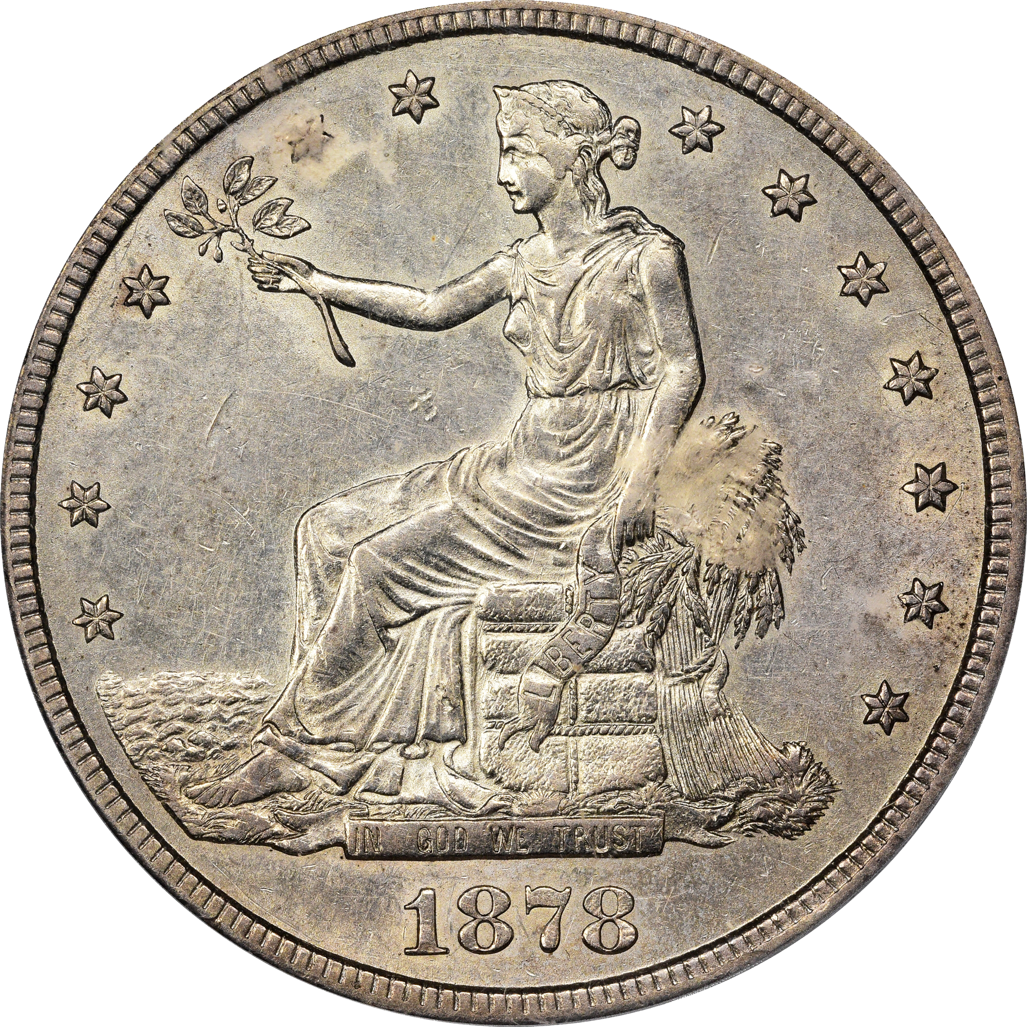 The United States Congress authorized the U.S. Mint to create a Trade Dollar to improve trade with the Orient, China in particular. It was legal tender all around the world, but especially in Asia and was minted from 1873 to 1885.