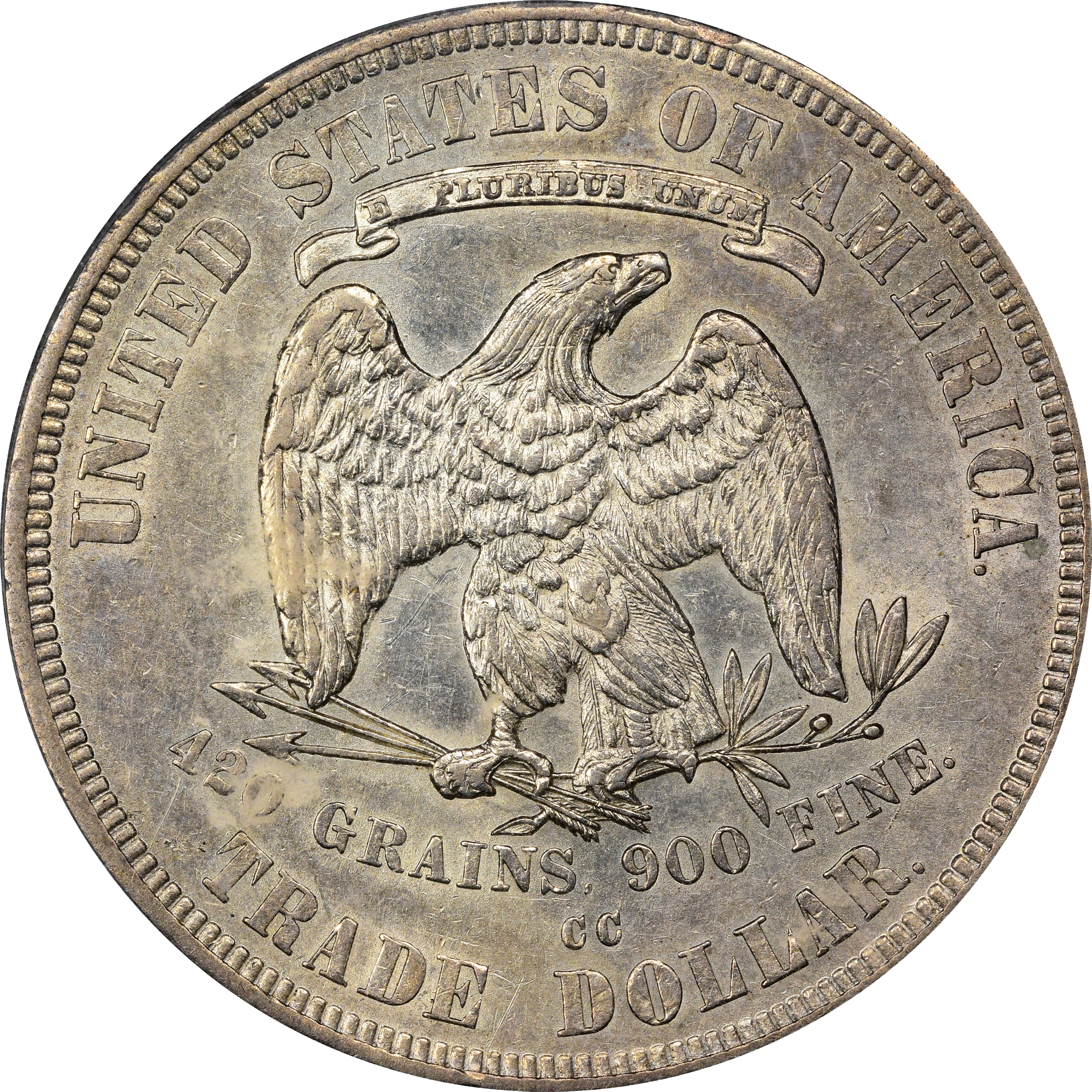 - Reverse: An American Bald Eagle facing right. A floating banner above the eagle states “E PLURIBUS UNUM” while above the banner are the words “UNITED STATES OF AMERICA.” The eagle holds three arrows in her right talon and an olive branch in her left. Below the eagle is the weight (420 grains) and the fineness (.900 Silver). Below is the denomination “TRADE DOLLAR” at the bottom of this reeded edge coin.