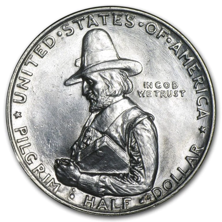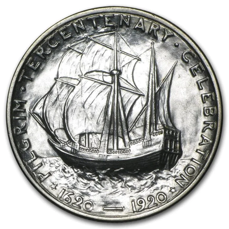 - HONORING THE PILGRIMS – This coin pays tribute to the 300th anniversary of the Pilgrims arriving at Plymouth Rock. It shows Governor William Bradford on the obverse and the Mayflower on the reverse.