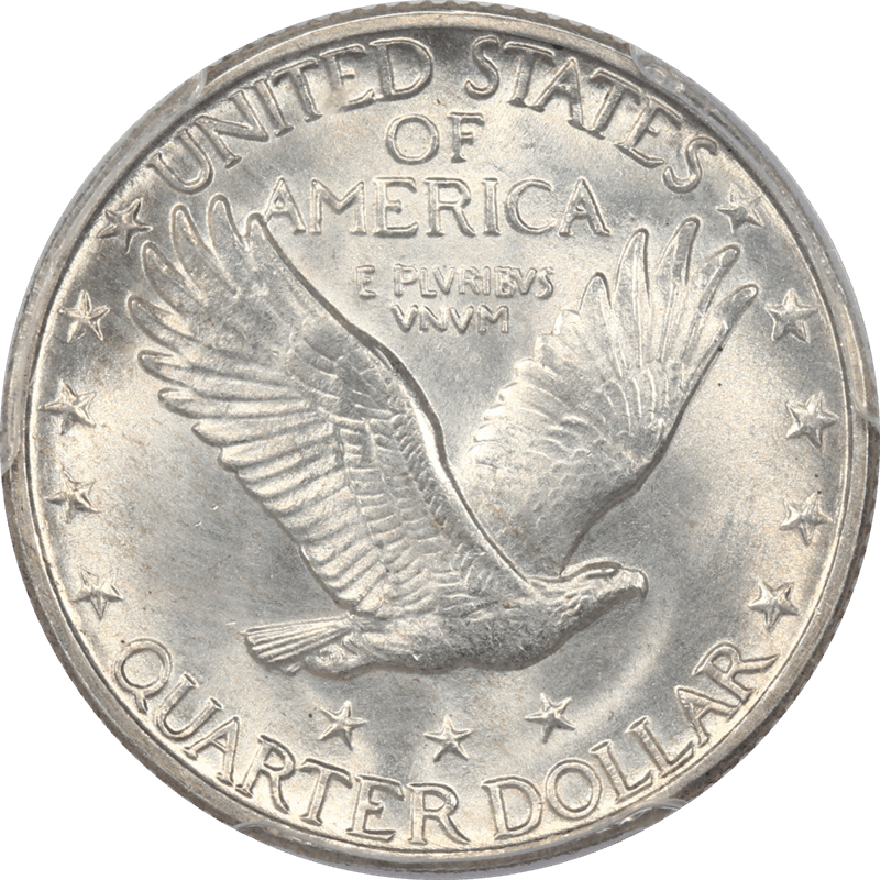 Standing Liberty Quarter (1916 – 1930) - The renaissance of U.S. coinages began in the early part of the century, and ultimately included all of the circulating coins. The silver coin designers were chosen by competition through the Commission of Fine Arts and the winner for the quarter dollar was Herman MacNeil. His standing portrait of Liberty with shield and outstretched hand clutching an olive branch was originally produced with her breast exposed. This met with both praise and horror and under pressure a chain mail covering was draped across her chest in the second year of production. The Type one version with bare breast is a popular type and interesting historical artistic reach for the Mint. The Type two versions with covered breasts additionally had the reverse star arrangement changed. MacNeil’s intricate design forced various changes during the series run including a major change in the pedestal in 1925 to create a recessed date. Overall, the design proved difficult to produce in full relief. Today collector’s look for fully struck examples with full head detail and clear delineation on the shield rivets.