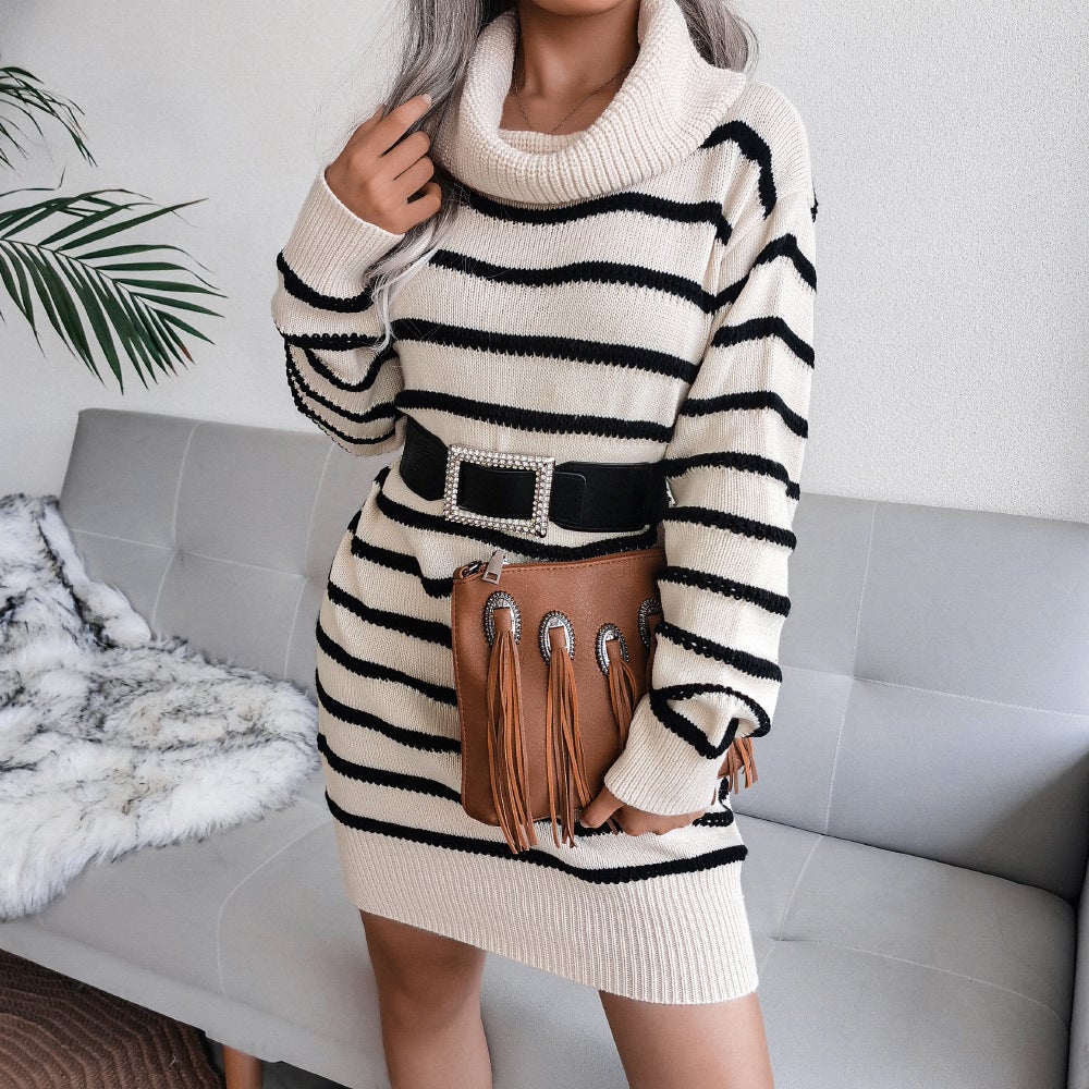 High Neck Striped Knitted Sweater Dress