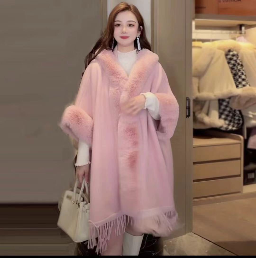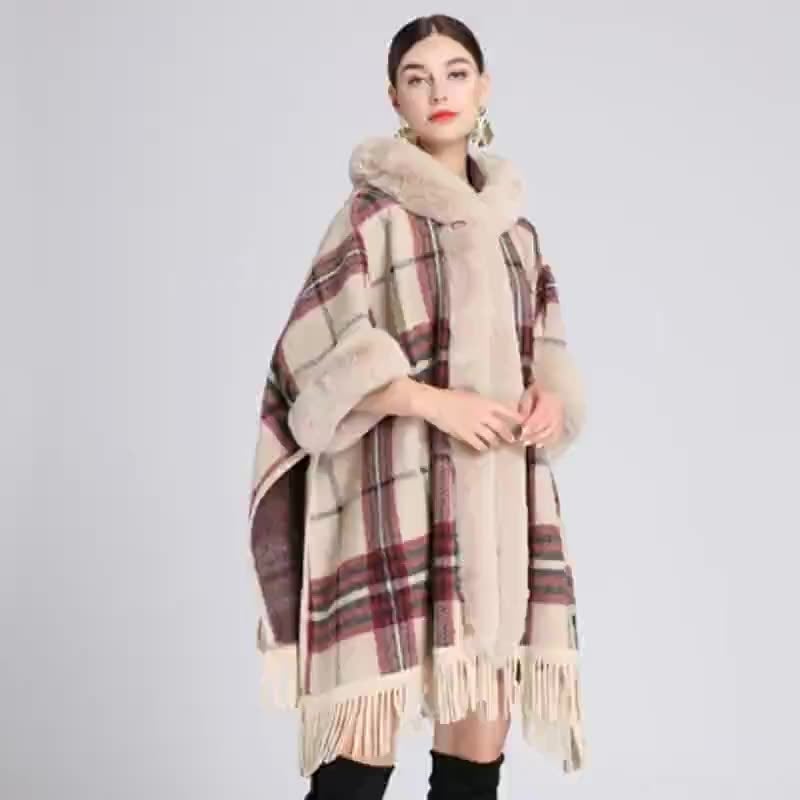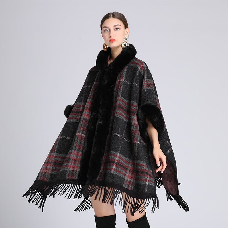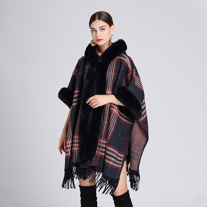 Hooded Shawl Coat With Fur Collar Plaid Coat