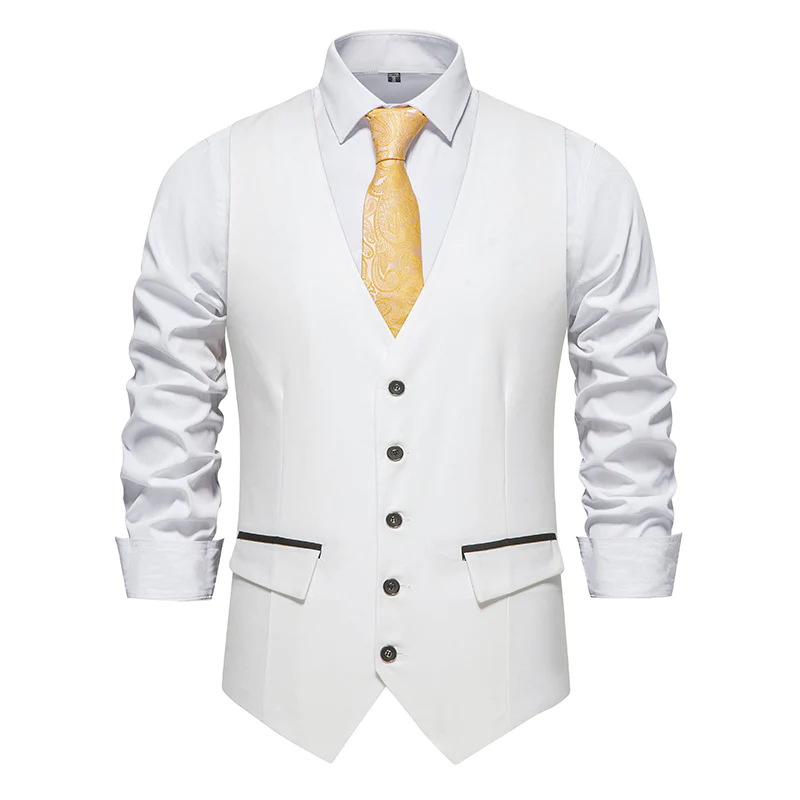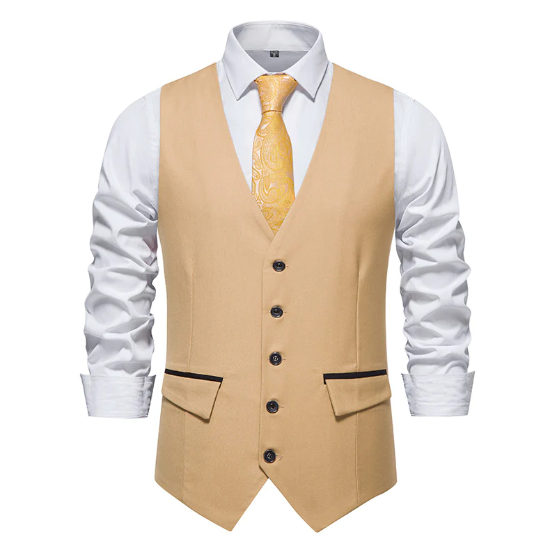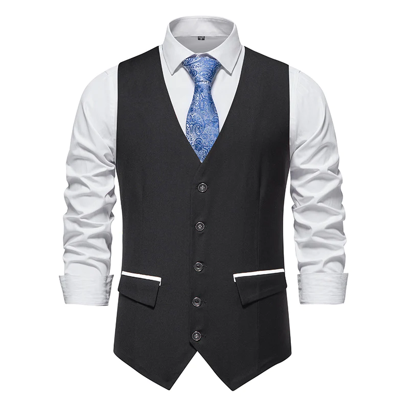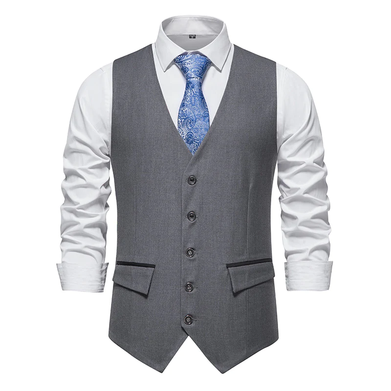 - Classic single-breasted vest design,V-neck, 5 buttons and 2 real side flap pockets with 2 fake pockets decor.