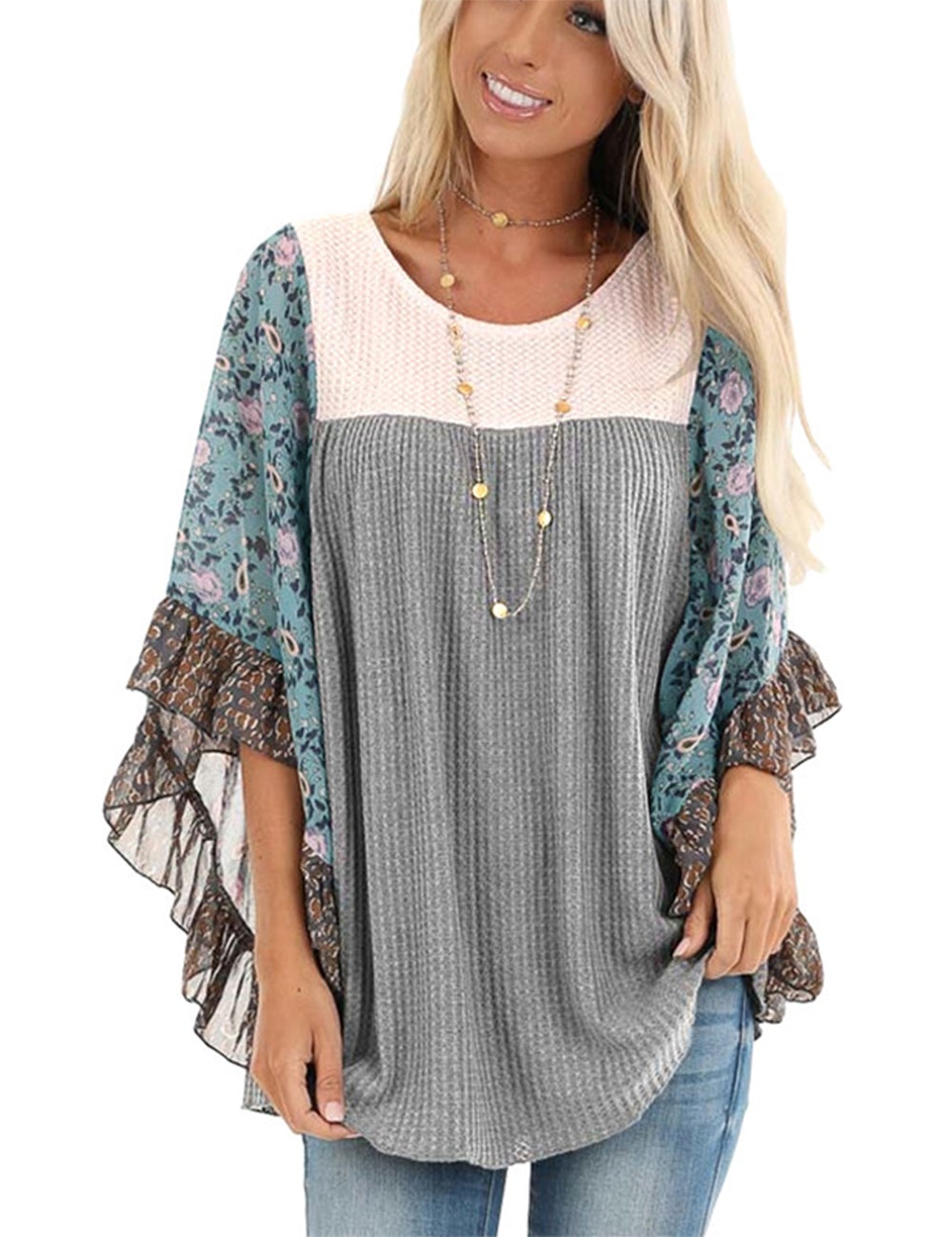 Women's Floral Chiffon Sleeve Waffle Knit Blouse