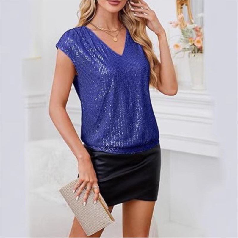 Women's Sequins Sexy V-Neck Sleeveless Solid Blouses Party Shirts Tank Tops