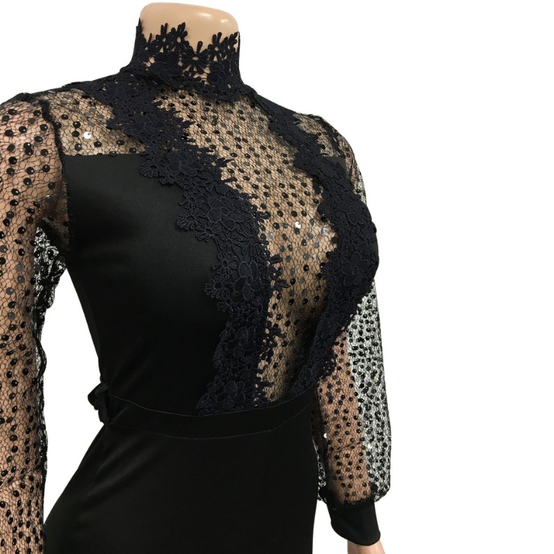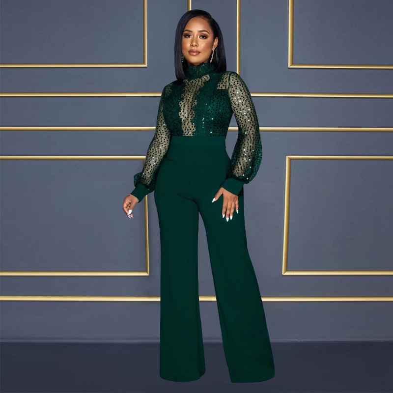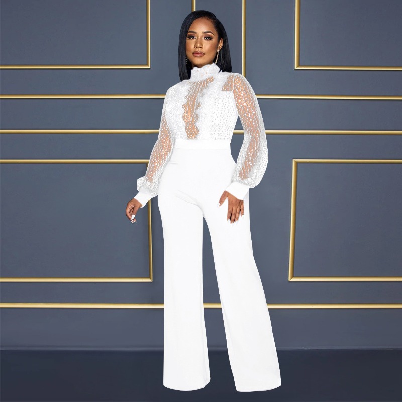 Women's Sexy Lace Mesh Patchwork Sequins Crochet Party Wide Leg Jumpsuits