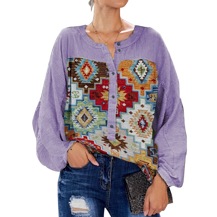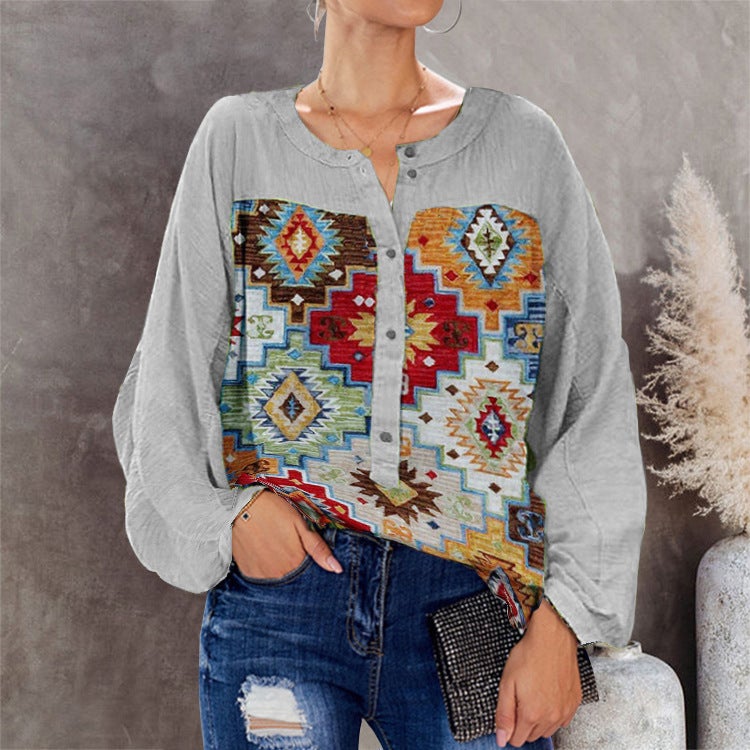Women's Shirt Round Neck Shirt Button Retro Rrinting Long-sleeved